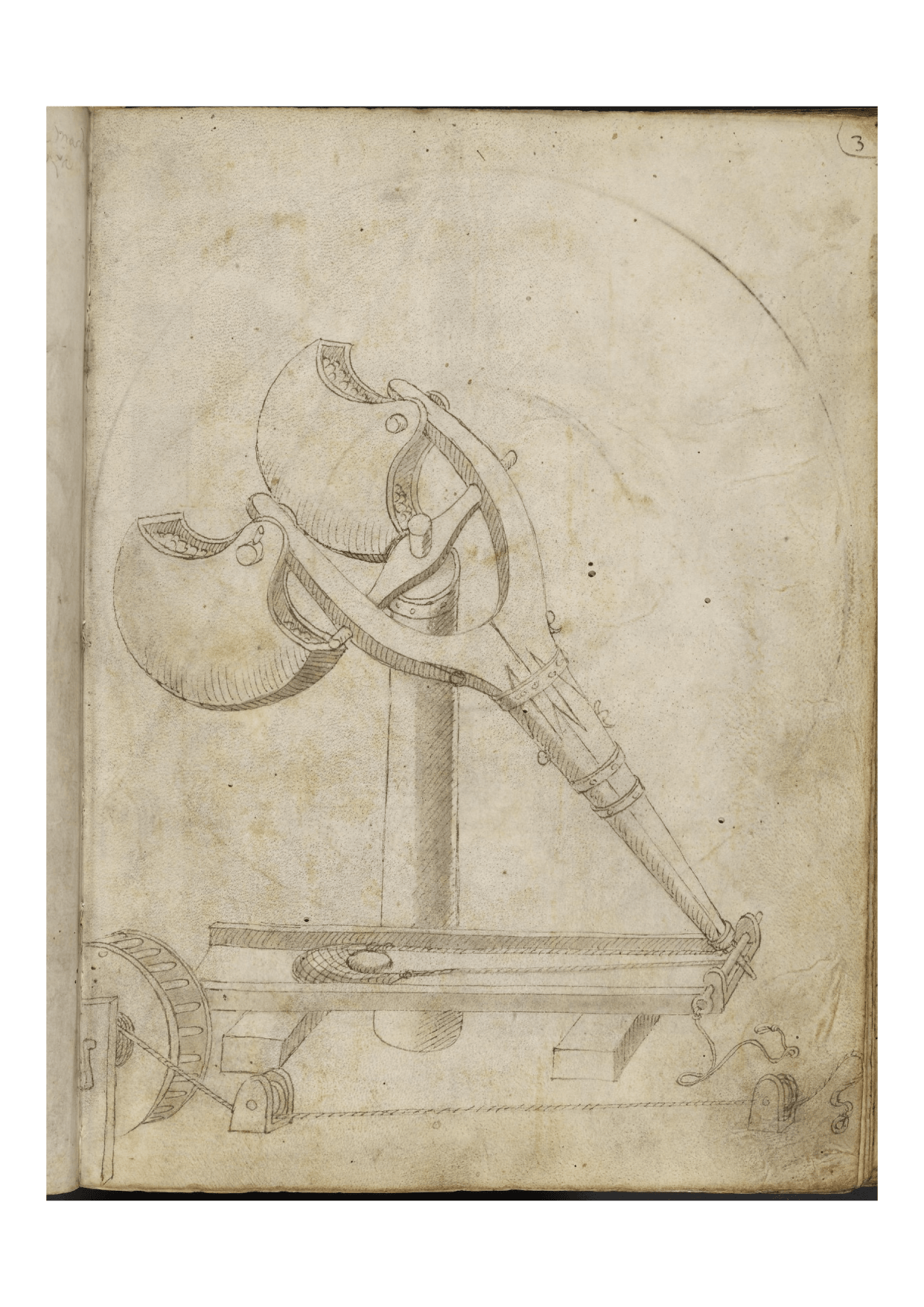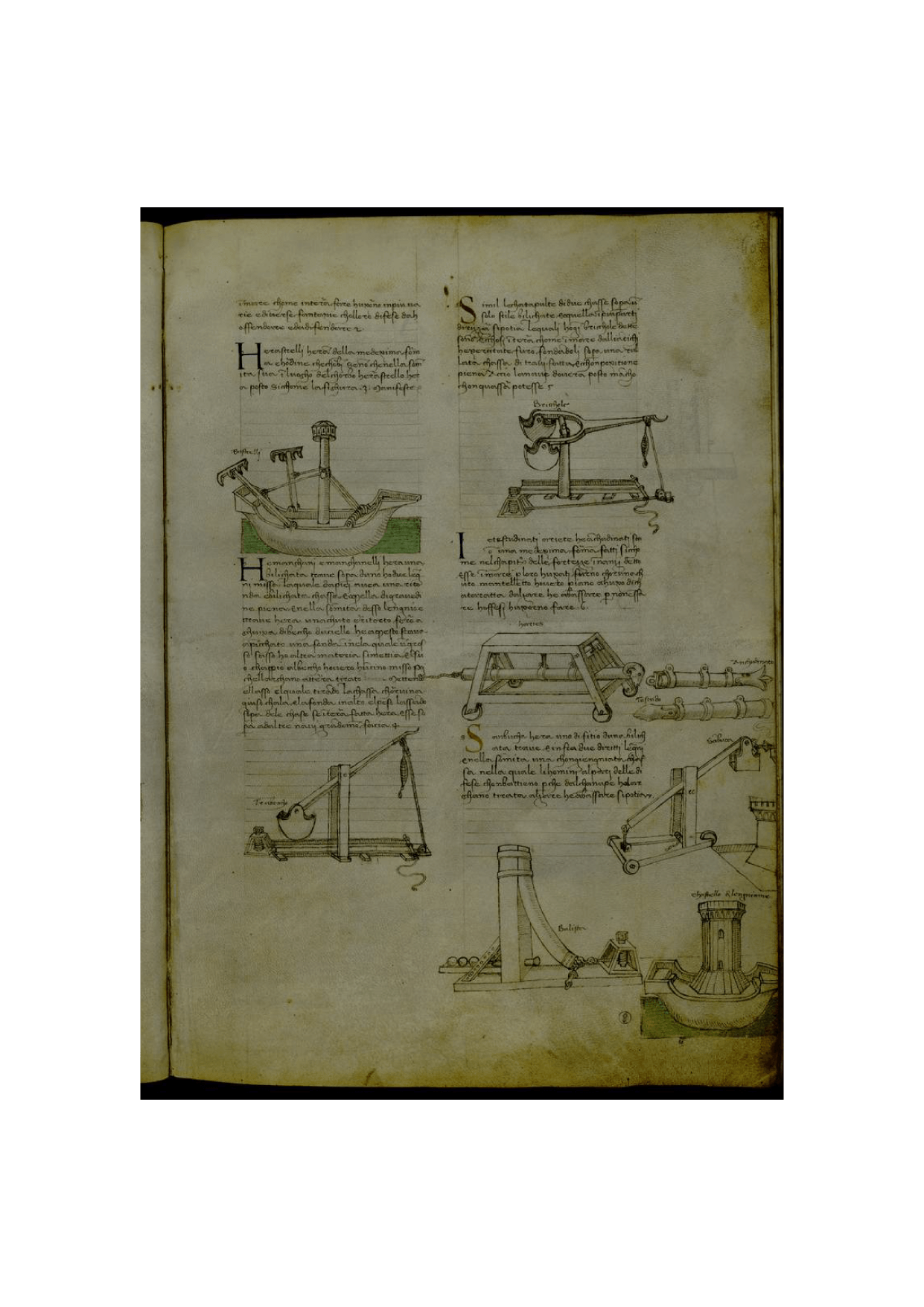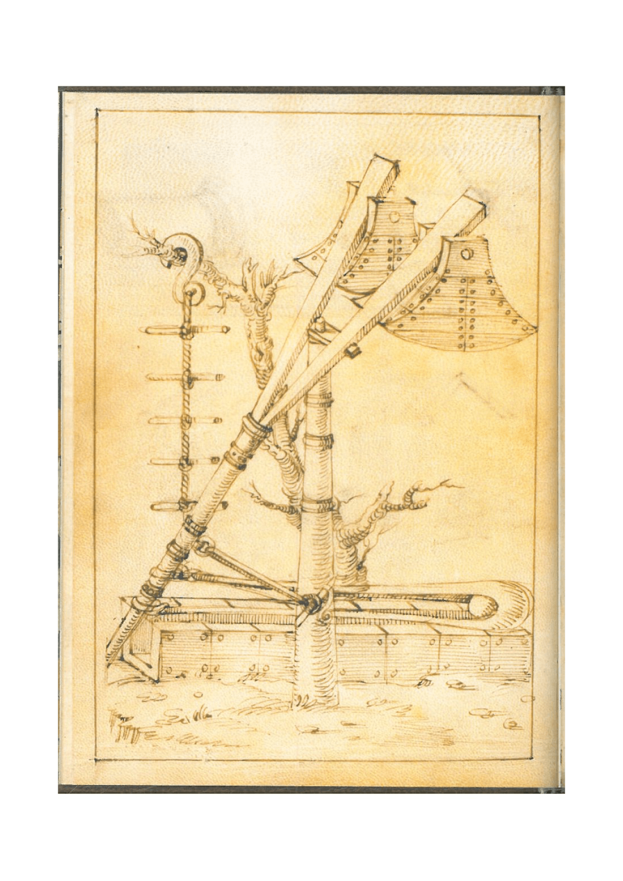 Roberto Valturio, De re militari libris 12 multò emaculatius, ac picturis, quae plurimae in eo sunt, elegantioribus expressum, quàm cùm Veronae inter initia artis chalcographicae anno 1483 inuulgaretur, Parisiis, apud Christianum Wechelum, sub insigni scuti Basiliensis, a cura di Paolo Ramusio,1534, Libro X, p. 277. Pesaro, Ente Olivieri – Biblioteca e Musei Oliveriani